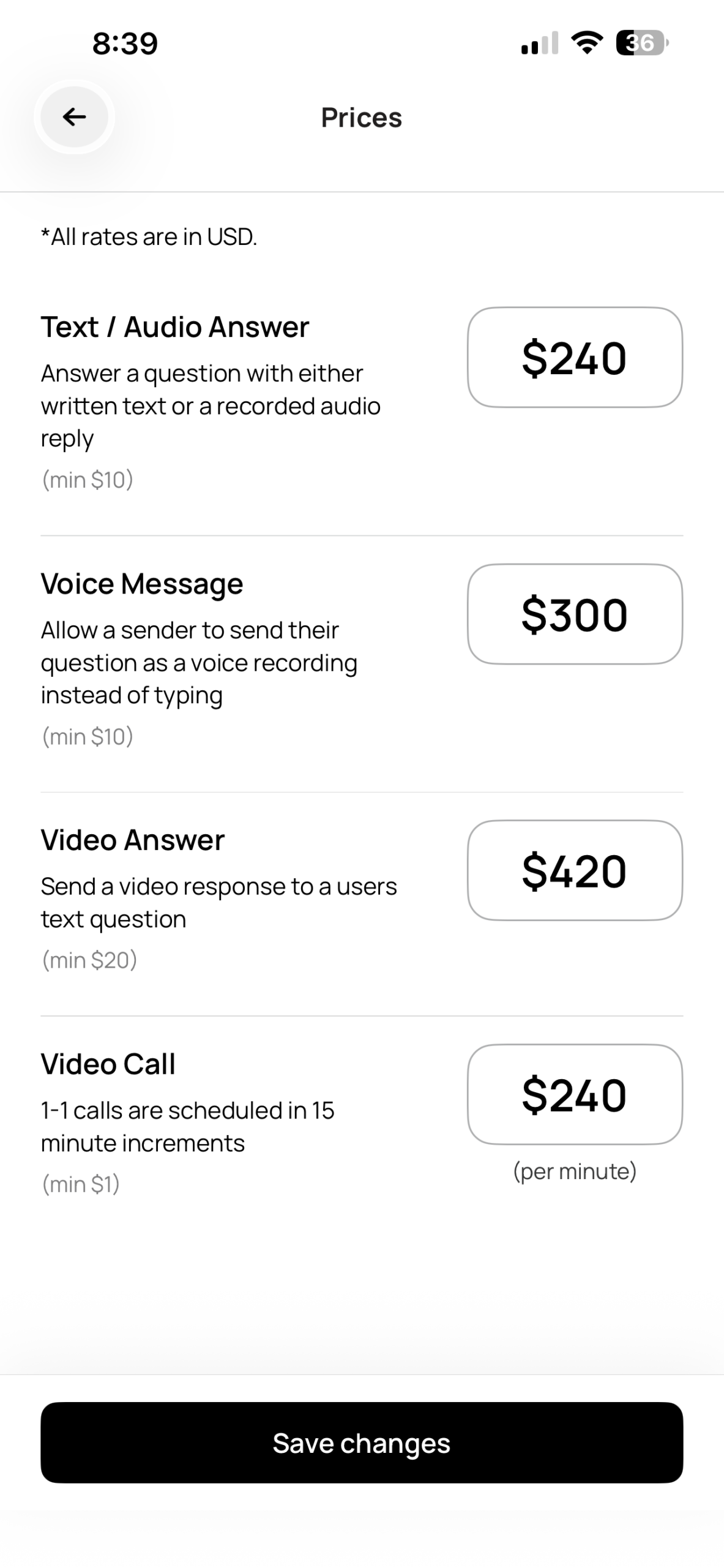 Users choose how they want to connect. Text message, phone call, video call, or video response. You set the rate for each format.